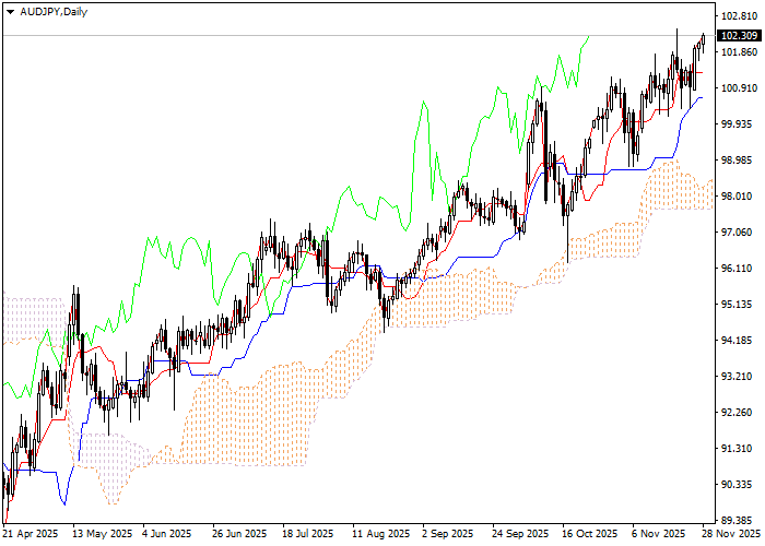 Im Tageschart Linie Tenkan-Sen ist oberhalb der Kijun-Sen, Linien sind horizontal. Unterstützungslinie Chikou Span ist über dem Preischart, laufende Wolke — aufwärts. Werkzeug wird oberhalb der Tenkan-Sen und Kijun-Sen gehandelt, indem die Aufwärtsbewegung fortgesetzt wird. Als nächste Unterstützungslinie dient Linie Tenkan-Sen (101.655). Als vermutliche Widerstandslinie dient eines von früheren Tiefs der Linie Chinkou Span (104.032).