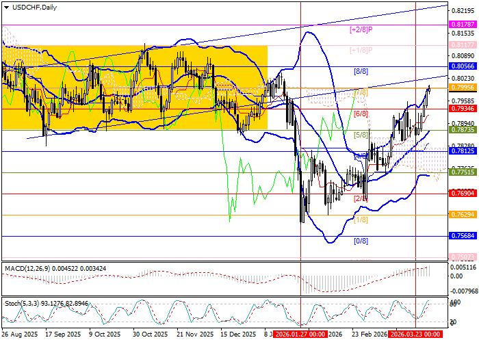 Das Devisenpaar USD/CHF legt den zweiten Monat in Folge zu: Der Kurs korrigiert inmitten des mittelfristigen Abwärtstrends und testete das Niveau von 0.7995 (Murrey [7/8]): Die US-Währung fand Unterstützung vor dem Hintergrund der eskalierenden Spannungen im Nahen Osten.