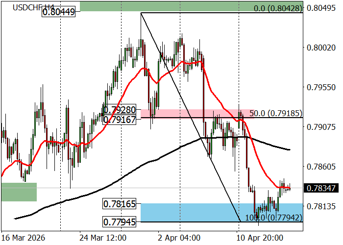 Der mittelfristige Trend bleibt aufwärtsgerichtet: Am 31. März näherten sich die Notierungen der Zone 2 (0.8068–0.8044) und drehten in eine Korrektur um, in deren Rahmen sie den Unterstützungsbereich 0.7928–0.7916 testeten. Es ist jedoch nicht gelungen, das März-Hoch zu erneuern: Der Kurs brach nach unten aus. In dieser Woche erreichte der Rückgang den Trendunterstützungsbereich 0.7816–0.7792, von dem aus Long-Positionen mit Kurszielen von 0.7918 und 0.8042 relevant werden.